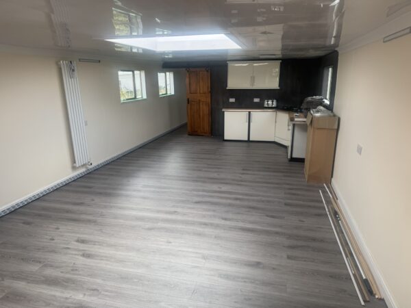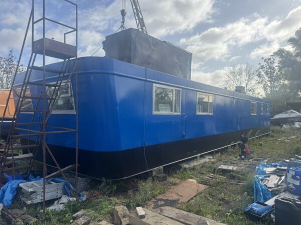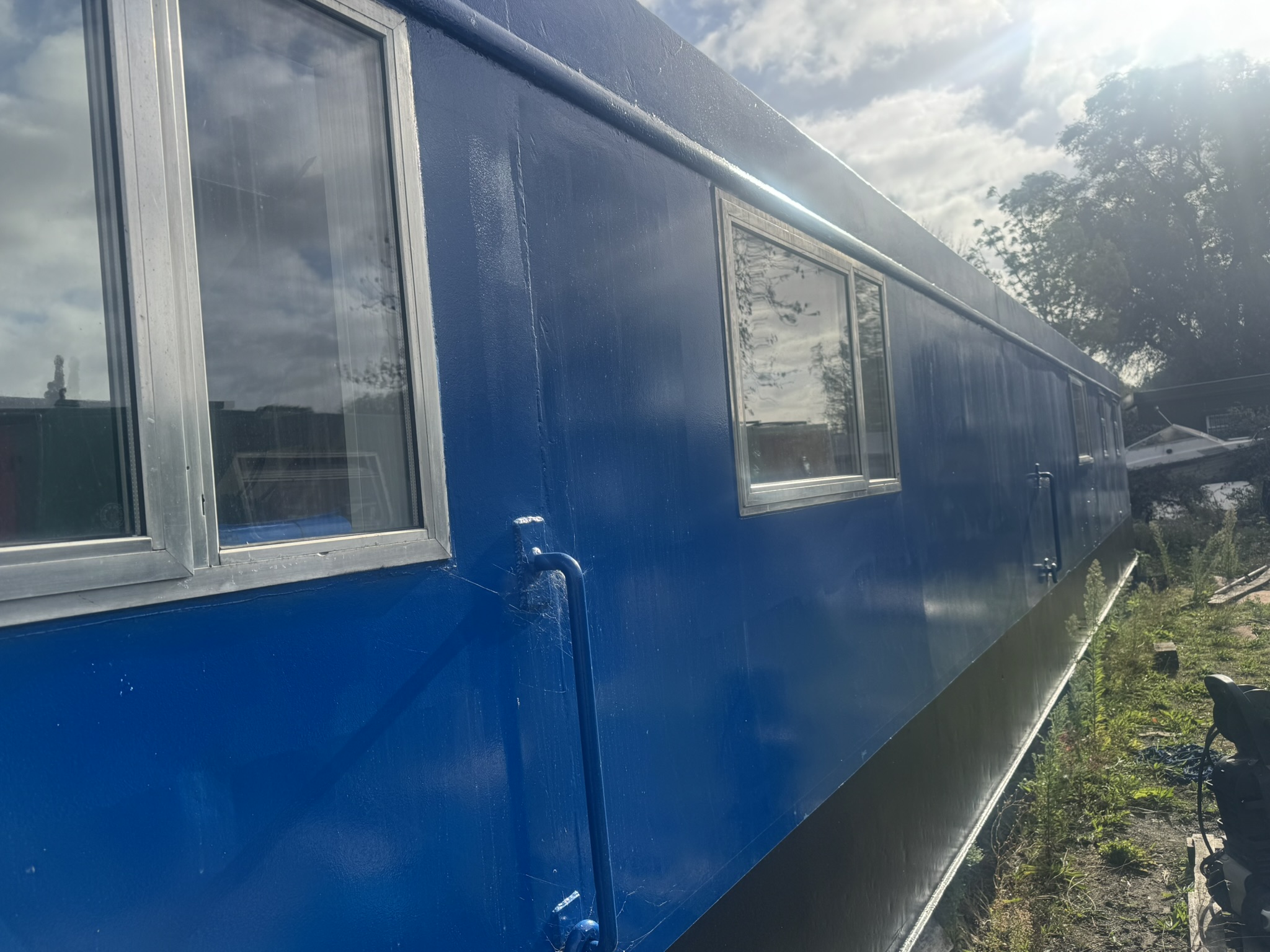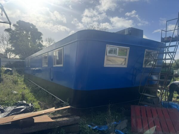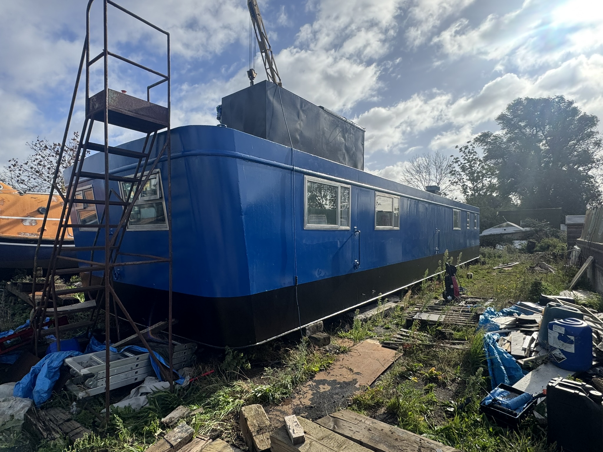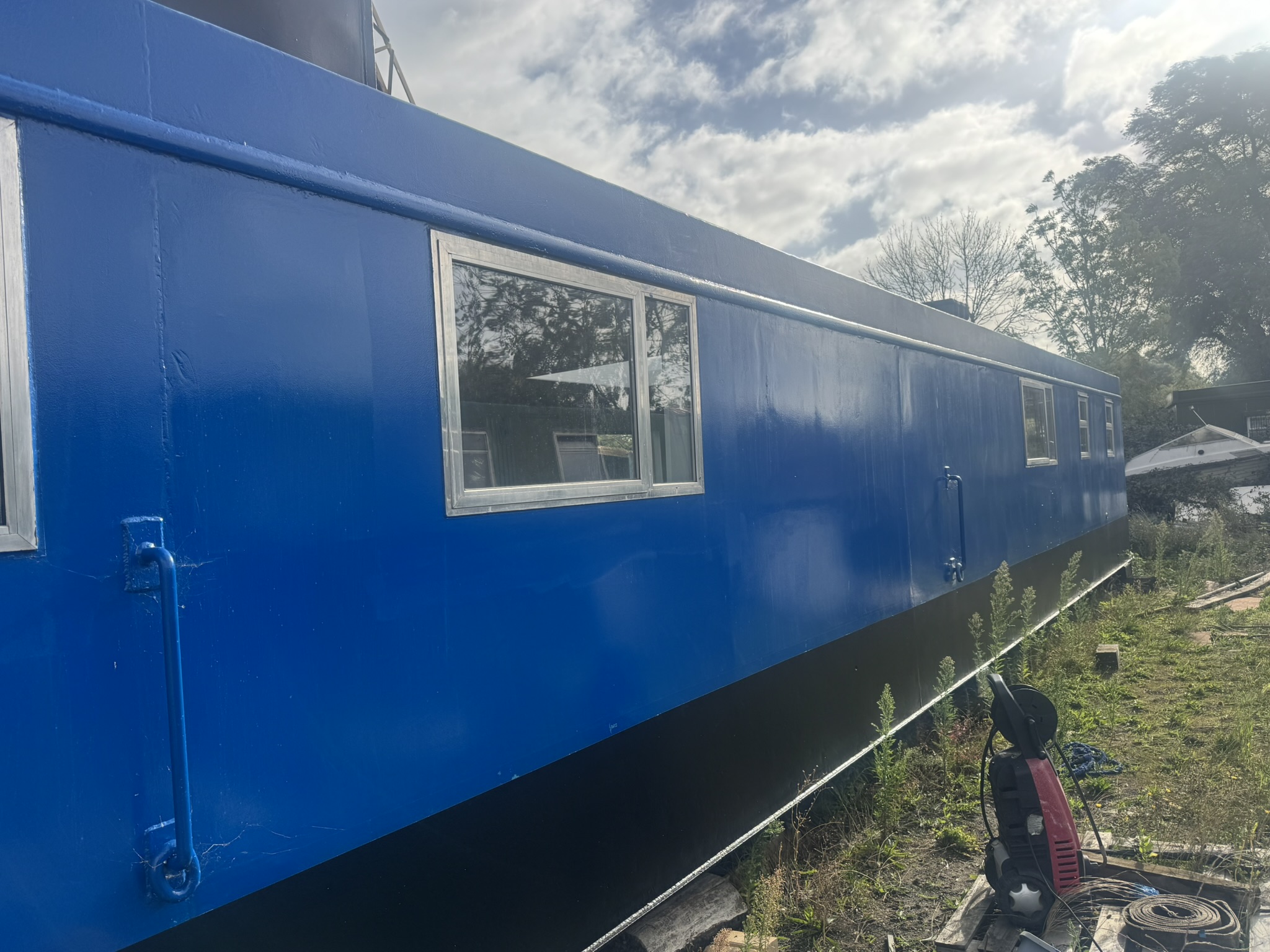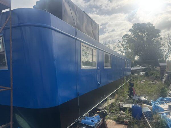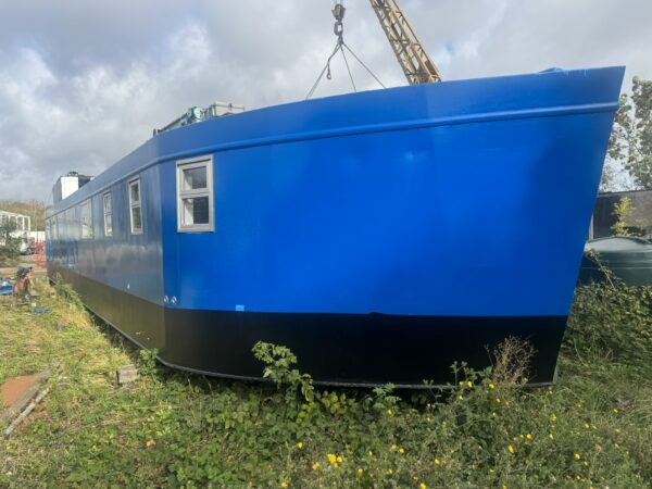 Welded steel plate hull and superstructure (12mm/6mm/6mm), aluminium framed double glazed windows, triple glazed plastic domed skylight. Inside hull sides have been painted with oxide before being fully insulated with spray foam. The hull has been etch primed and will be painted with 2 pack epoxy, along with the exterior paintwork which is to be renewed in dark blue (Due to be completed in April 2025, weather permitting). Floored throughout with treated planking, grey laminate flooring in the saloon, galley and main bedroom. Stud walls with 9mm ply and ceiling with 8mm hollow plastic planking. A recent hull survey found the vessel to be in "Above Average Condition" for it's type and age.