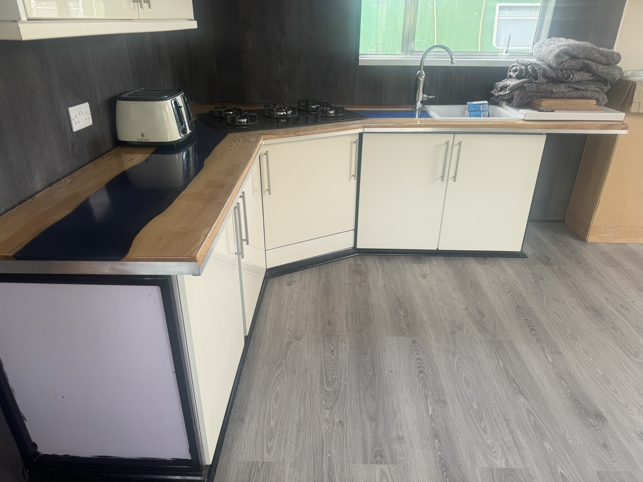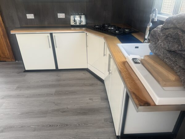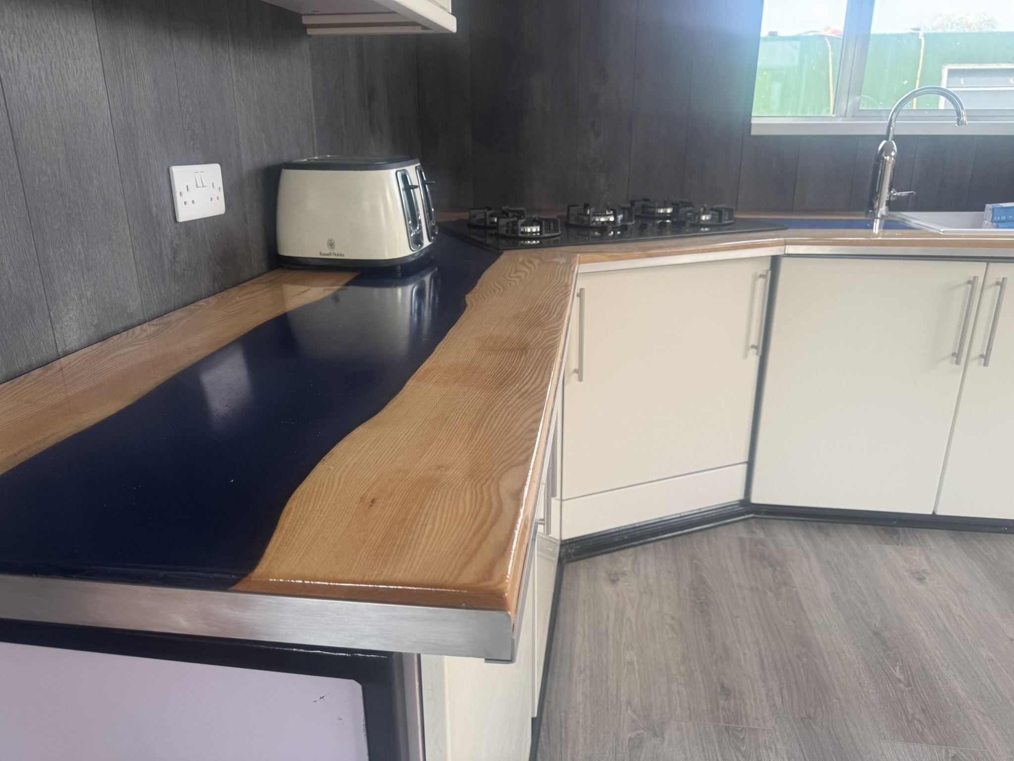 Open Plan Saloon + Galley (12'11" x 27'6") - attractive living area with plenty of space for storage and furniture. Galley contains a range of fitted base and wall units with white cabinetry, handcrafted worktops with dark blue epoxy resin inlay running down the centre. 5 - ring LPG hob, toaster, sink and drainer with electric hot and cold water tap. Space for under counter or full sized fridge. Double glazed windows and large skylight allows plenty of natural light into the space. A wooden sliding door leads into-: