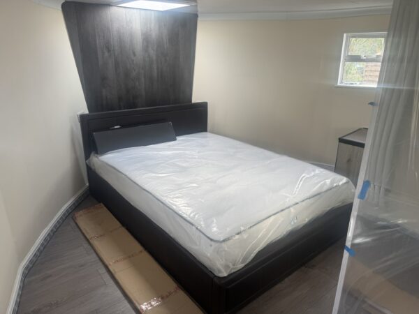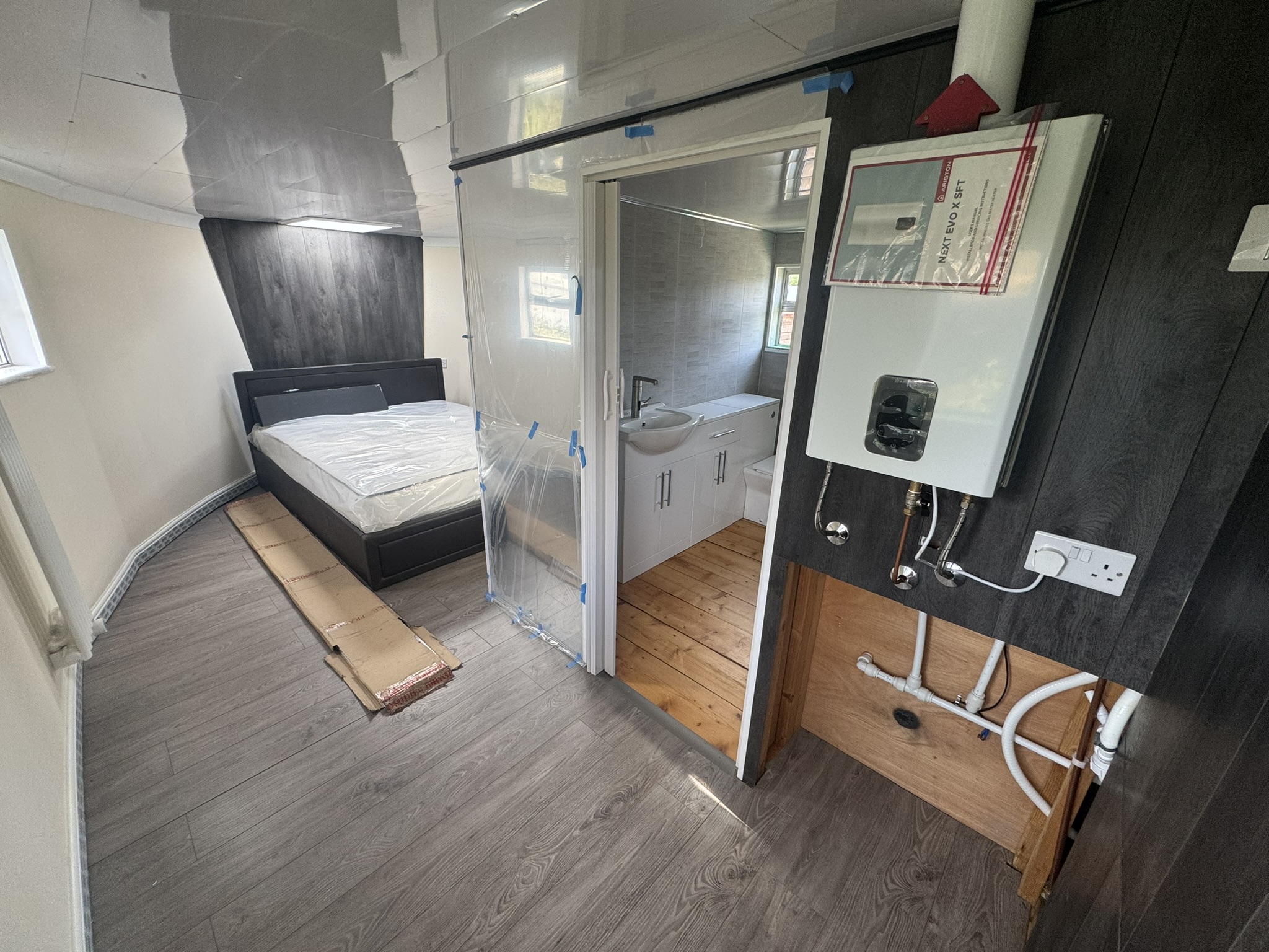 Master Cabin - Entering the space you will find the LPG boiler, which serves the bath and LPG Hob, mounted on your right as you enter the room (pipework installed), a double berth at the bow of the vessel and storage box which conceals the macerator and electrics for the toilet systems.