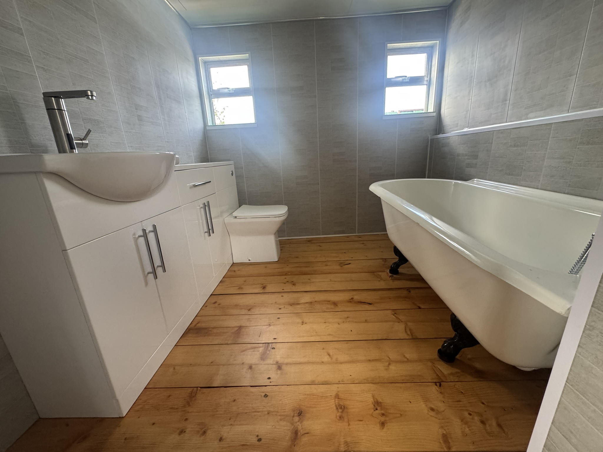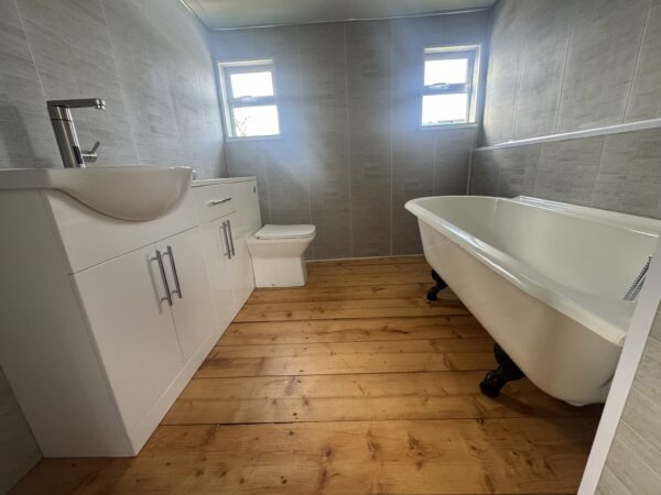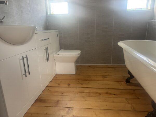 The bathroom/ ensuite is contained within the bedroom with wooden flooring, full sized roll top bath with chrome fixtures, a white vanity unit, sink with electric hot and cold water tap, toilet and ample storage.