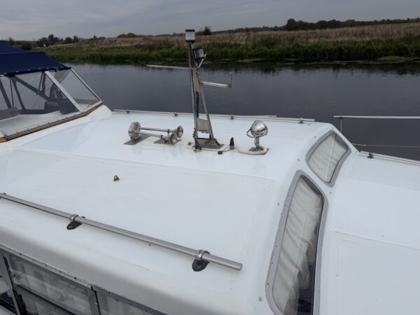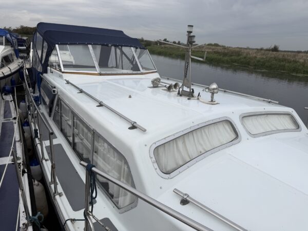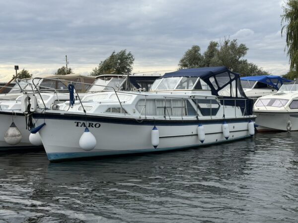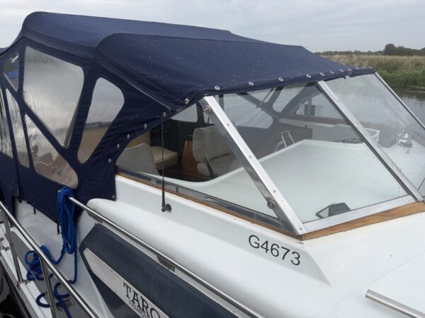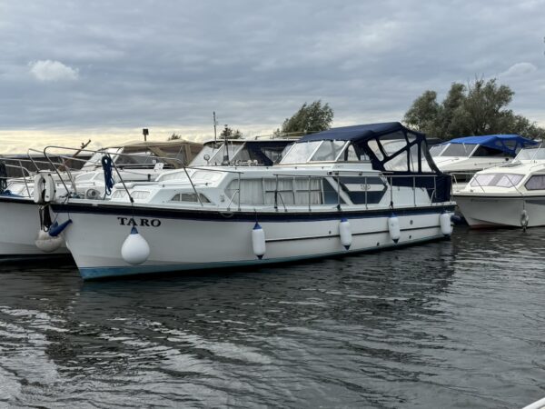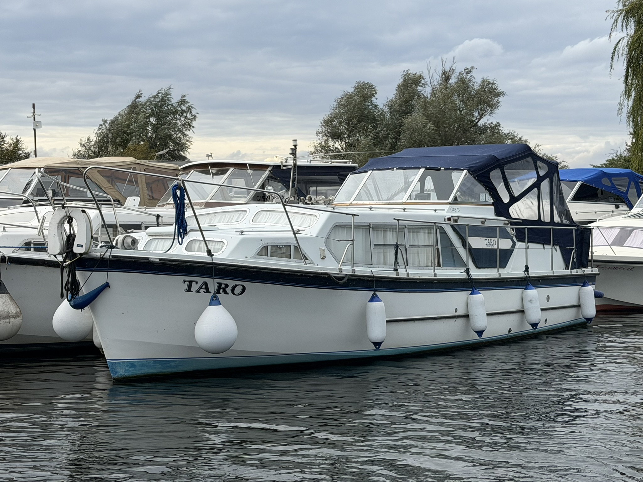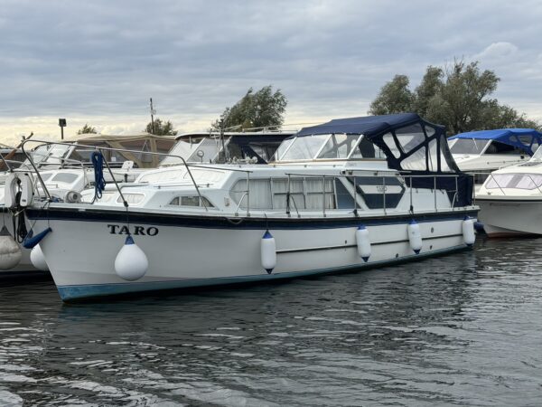 Taro is a nicely presented example of an Ocean 30 with the benefit of a folding canopy and screens allowing access under low bridges and with twin engines, she is a truly versatile craft for the waterways.