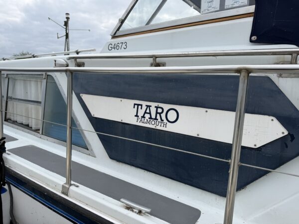 White (Painted) GRP moulded hull, topsides, decks and superstructure, grey painted non-slip deck panels, alloy framed cabin windows and folding screens with toughened glass, stainless steel pulpit rail, grab rails, stanchions and hand rails, stainless steel cockpit rail and bathing ladder, alloy/PVC gunwale fendering, stainless steel canopy frame, blue fabric cockpit canopy. Please note, although the hull topsides and superstructure have been painted, they still display a good quality finish. Taro was last out of the water and antifouled in Late 2022. Surveys were previously carried out in 2015, 2017 and 2022.