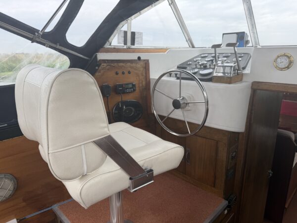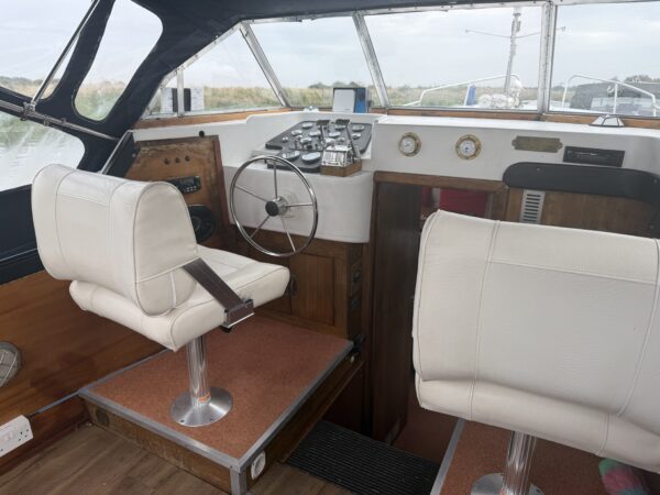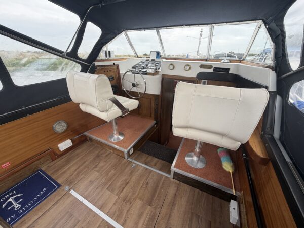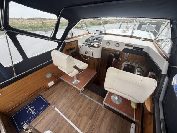 An easily accessed aft cockpit with rear bench seating, general stowage beneath, canopy with removable, zipped side panels, port side helm position, matching reversible helm's and co-pilot's chairs, lifting floor panels with access to the engines, batteries, LPG locker, fuel tank and bilge area