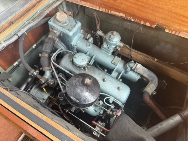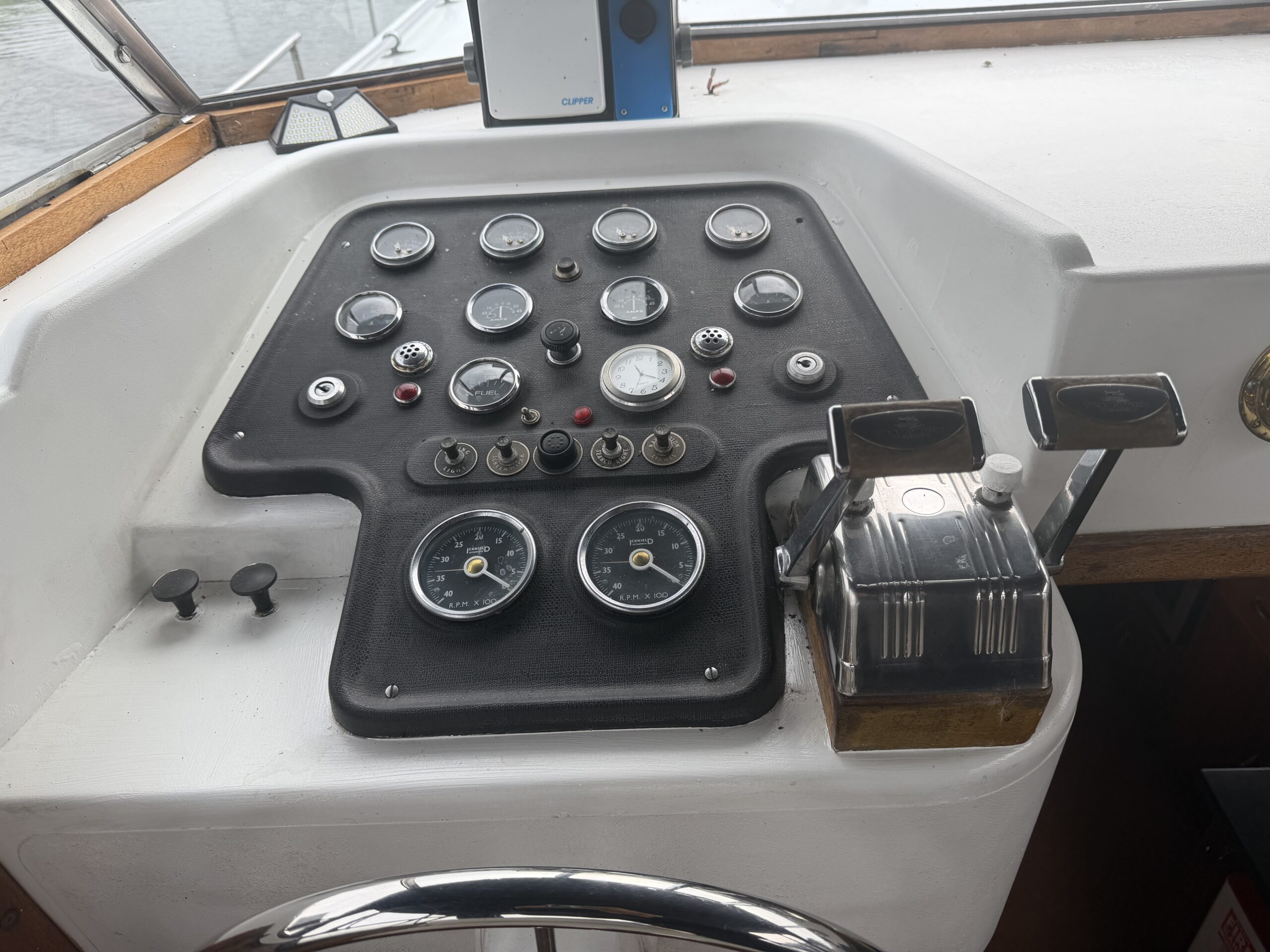 Mercedes OM636 diesel engines coupled to shaft drives with twin single lever engine controls. Fuel, RPM, temperature, alternator and oil pressure gauges.