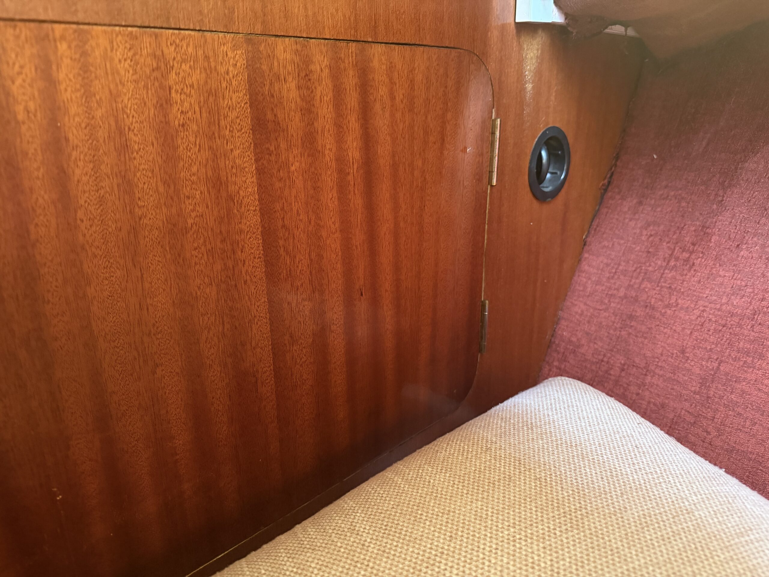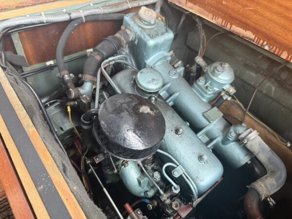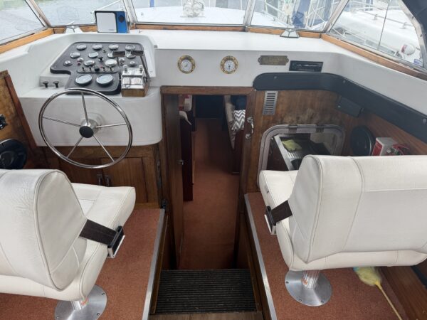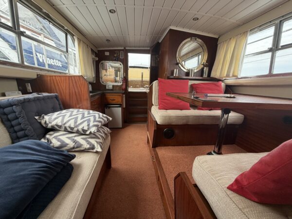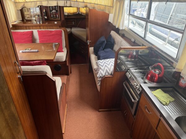 There are windows all round that provide light and air to the accommodation. The interior has been well maintained in its original varnished Sapele ply and timber to compliment the modern touches, including the head linings, which have been nicely re-done in white plastic panelling. Lighting is provided by LED and halogen lights.