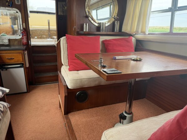 Dinette with storage beneath and pedestal table that drops down to convert into a double berth. There is a large storage locker between the dinette seating and forward bulkhead.
