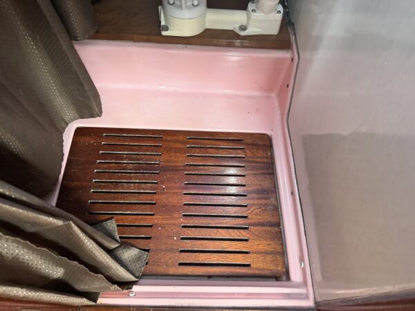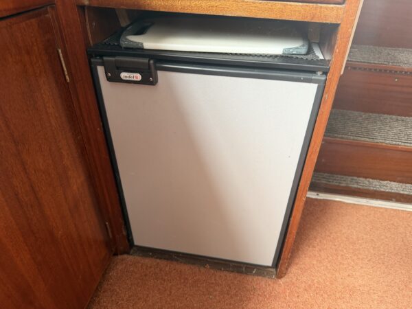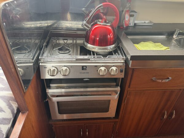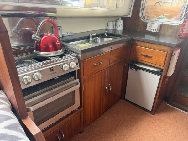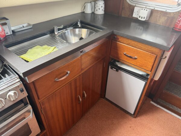 The galley to starboard has been re-fitted with a dark grey work top to compliment the original joinery incorporating a stainless steel sink and drainer with hot and cold taps, locker and drawer storage and an oven with stainless steel heat deflector.