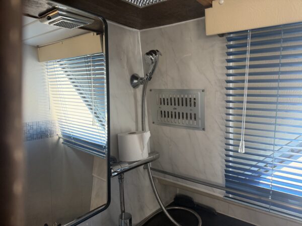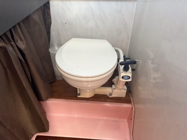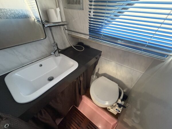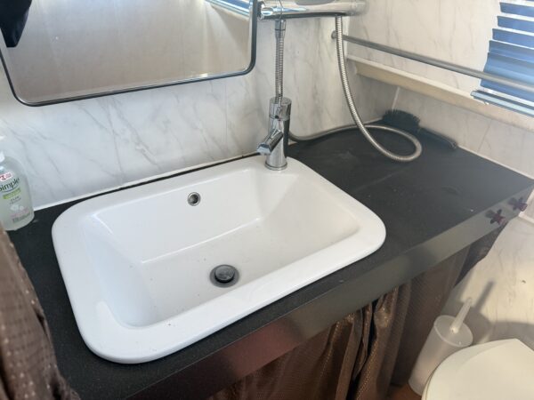 A WC & shower compartment to port with wash basin, mixer tap, shower attachment, manual sea toilet, mirrors and wipe down surfaces.