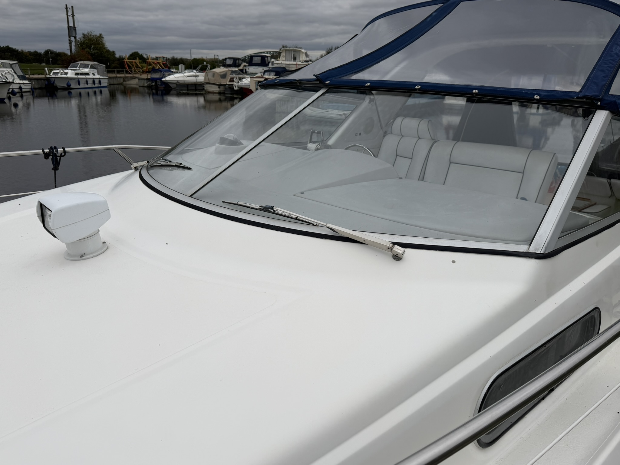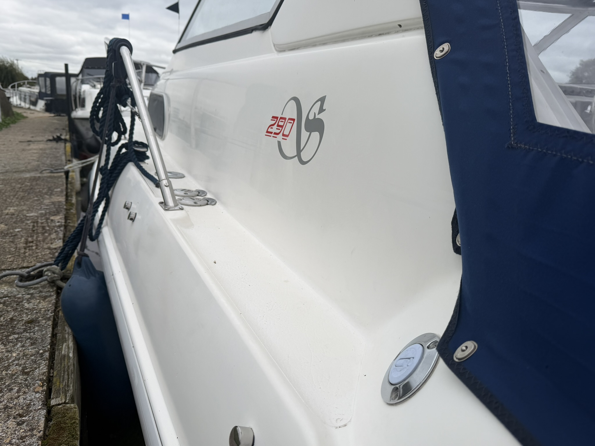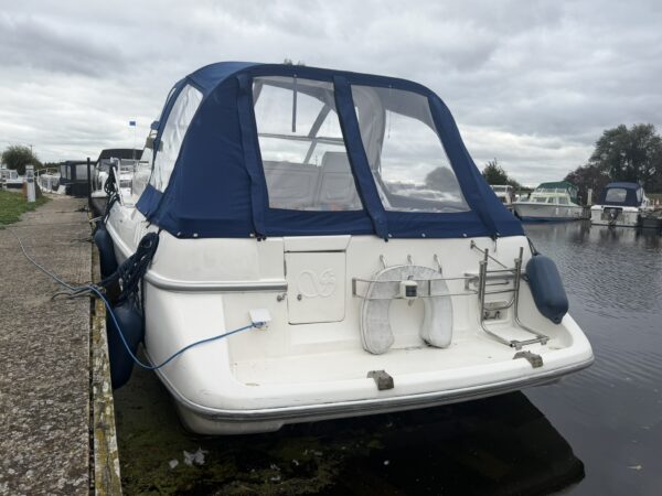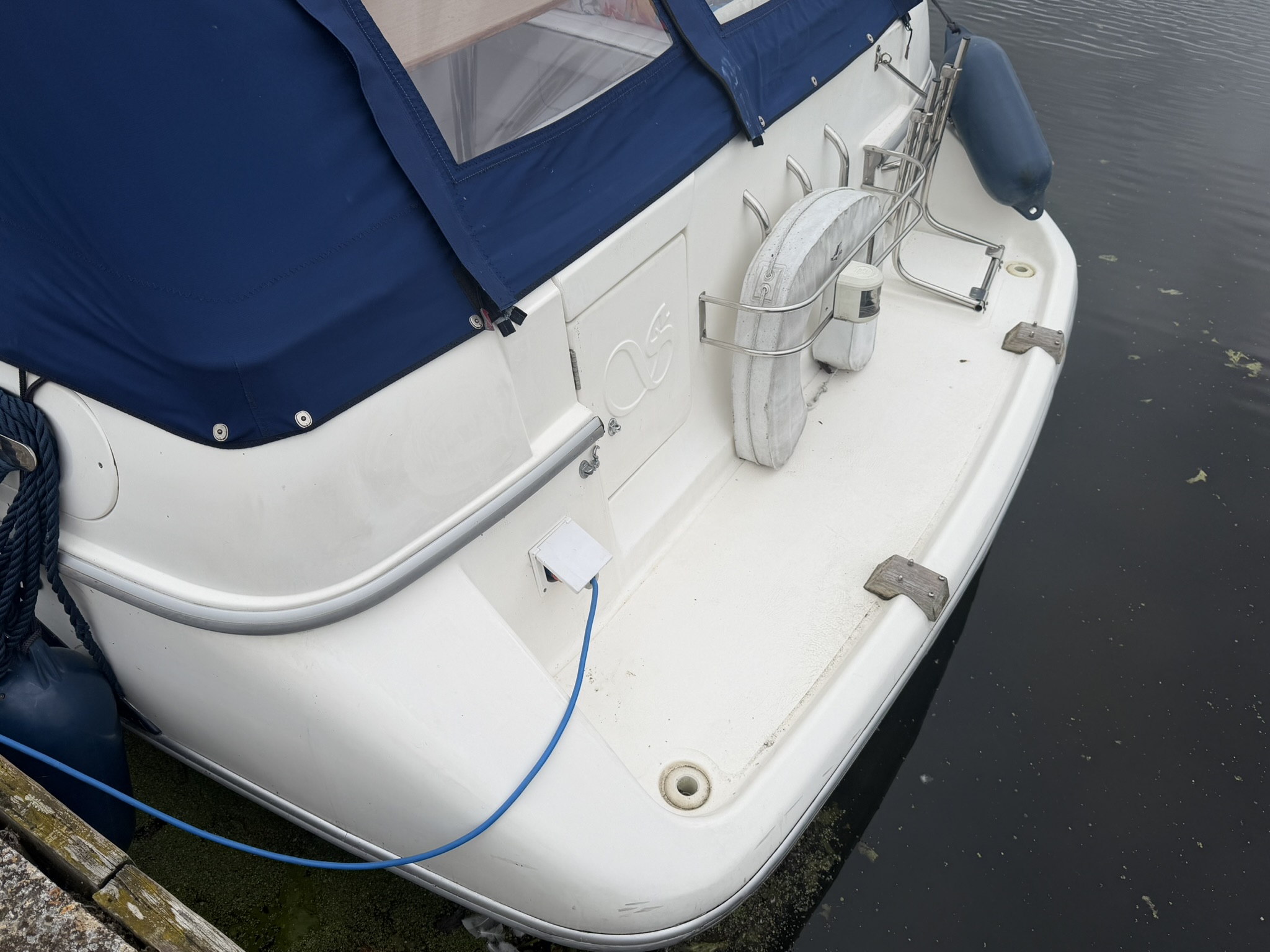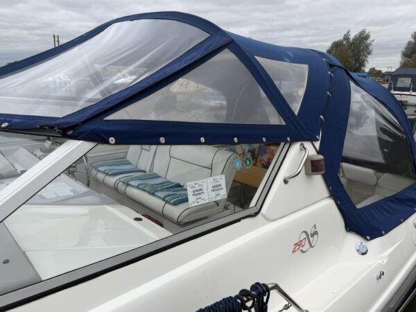 GRP moulded planing hull, decks, superstructure and bathing platform, stainless steel pulpit, guard rails, hand rails, fender baskets, folding boarding ladder, radar arch (hinged for lower bridges), alloy framed screens and cabin windows, Houdini deck hatch, alloy deck fittings, stainless steel canopy frame, dark blue fabric canopy with window panels and separate zipped sections. Last Antifouled in June 2024.