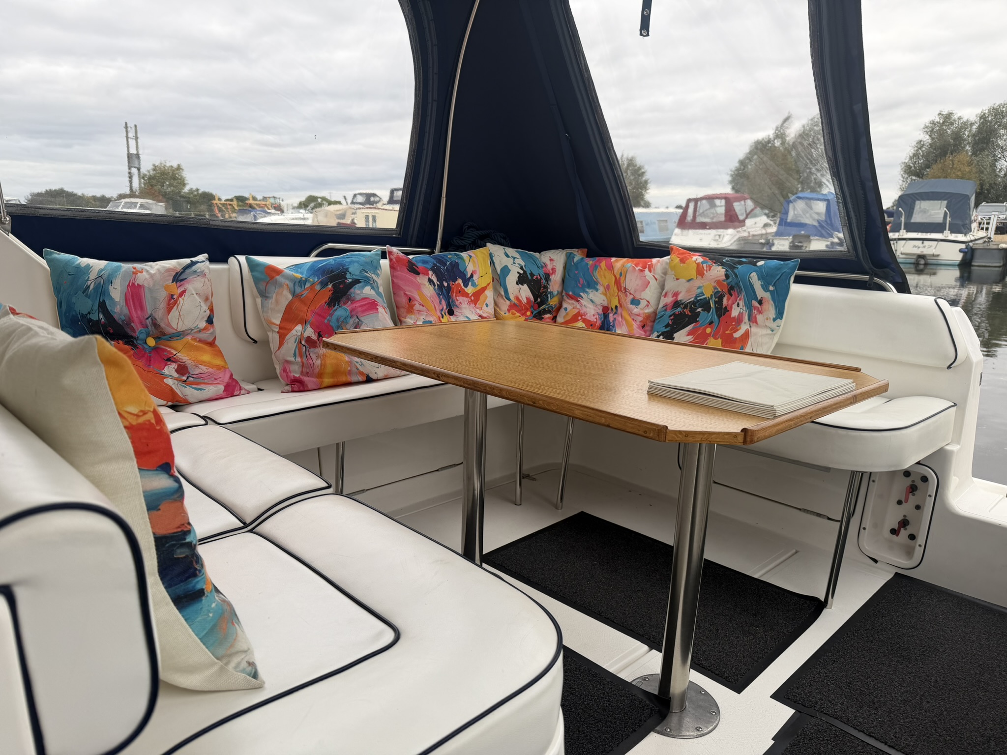 Spacious and sociable cockpit - white upholstered bench and U shaped seating with blue piping, helm's and double co-pilot's seats with lockers beneath, side lockers, cockpit table, large access hatch to the engine bay. The seating will comfortably accommodate 6-8 people in a sociable space, with or without the canopy up, and there is a window from the under-deck berth. The U shaped seating also allows access to the under-deck cabin. The companion way is to port leading to the cabin via shallow steps, comprising;