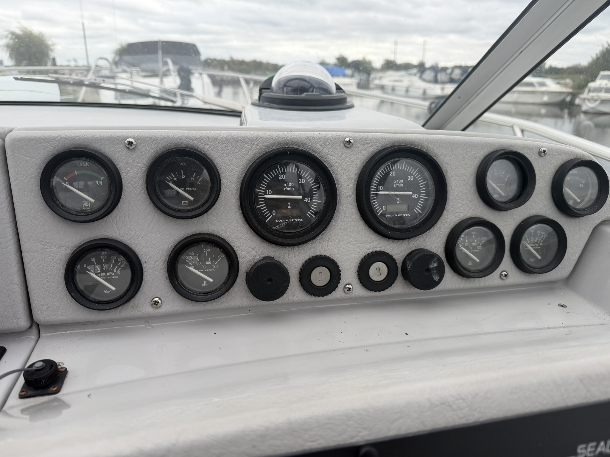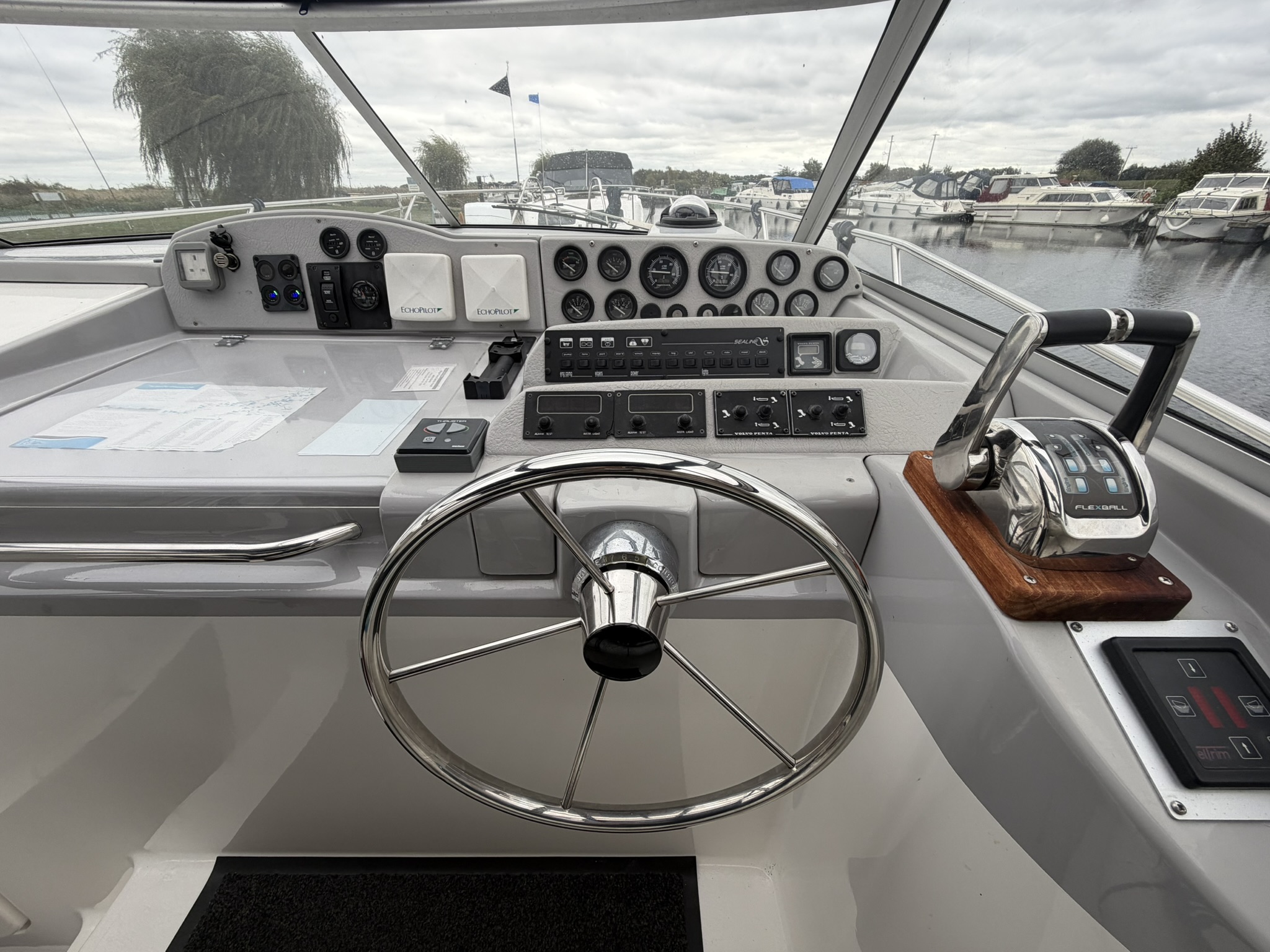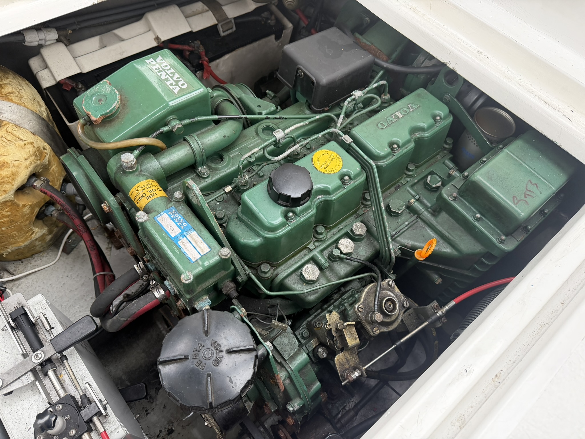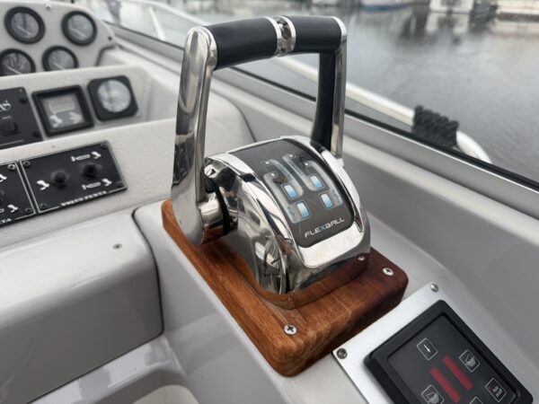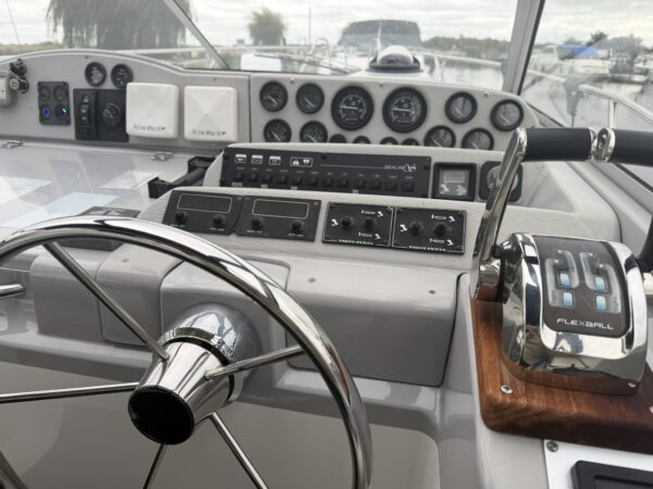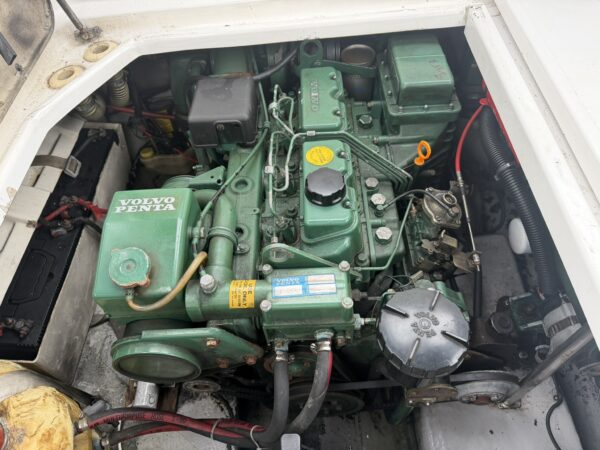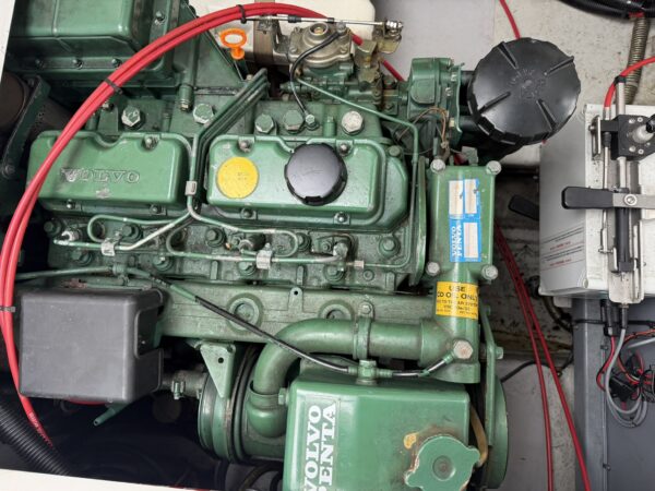 Twin Volvo Penta AD31DP diesel engines and duo prop Volvo 290 stern drives. Hydraulic Flexball throttle controls at the helm, Vetus Bow Thruster, power tilt, trim tabs, engine instrumentation (temperature, oil pressure, tachometer, voltage, water and fuel), Garmin Echomap chart plotter, Stowe depth and speed logs, compass. Engine last full service in April 2023, the sterndrives received a full overhaul in January 2025.