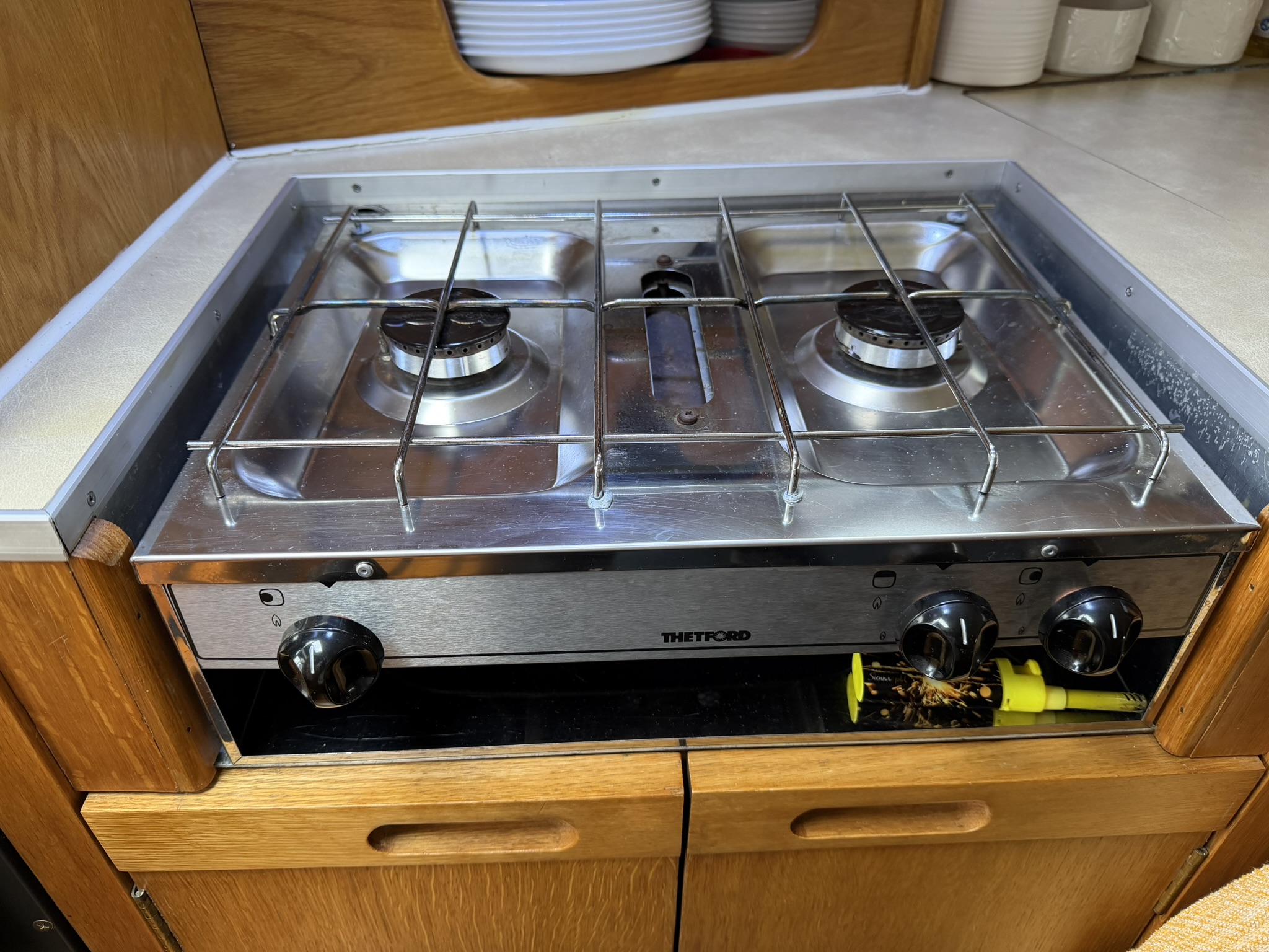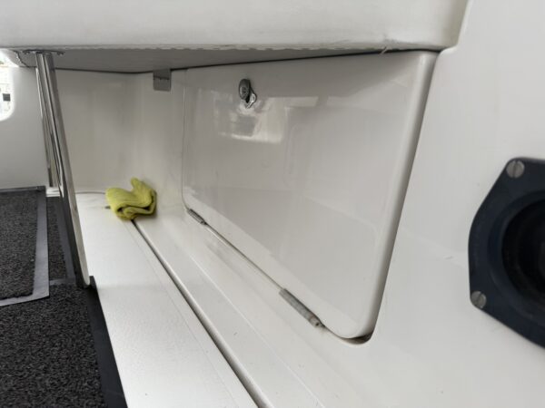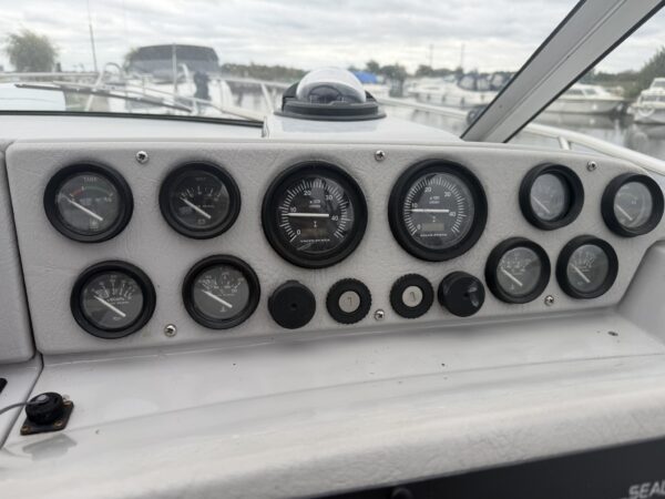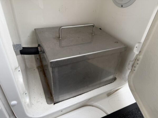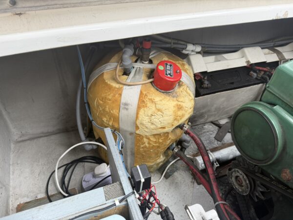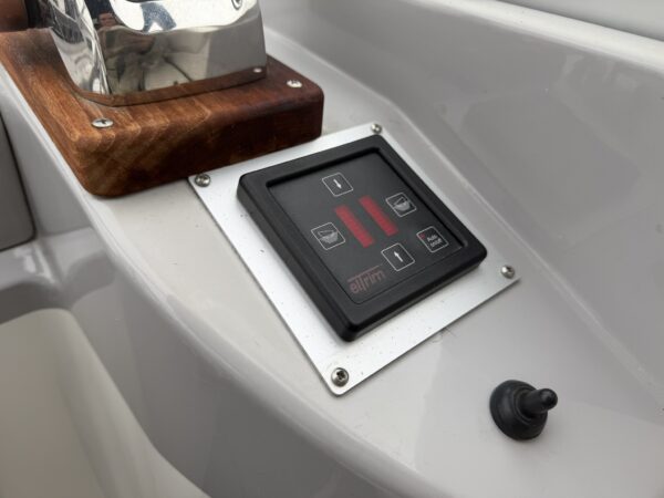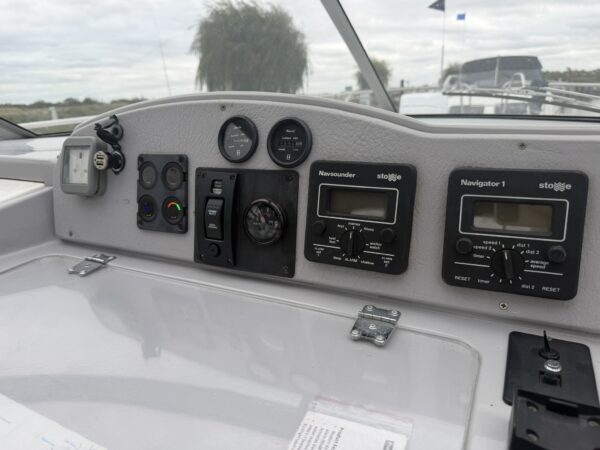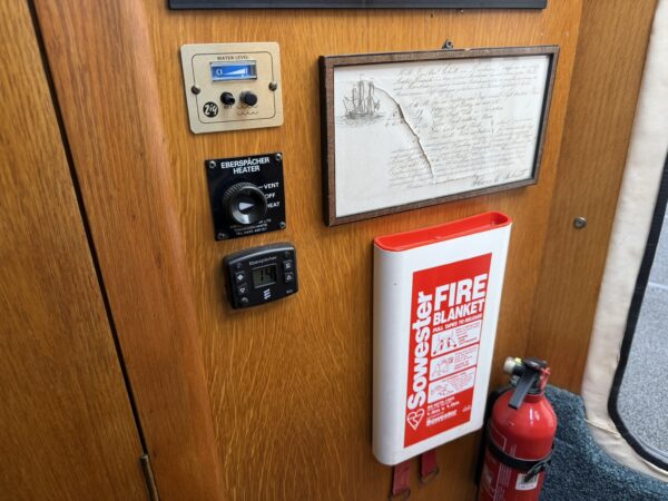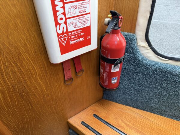 Fenders, Ropes, Horseshoe life ring, fire extinguishers, trim tab controller, Stowe Navsounder (Depth and Speed), Flogas propane bottle + regulator, Eberspacher Airtronic D2 air heater, calorifier + immersion heater, Garmin Echomap chart plotter, fire blanket, water tank and fuel gauges, Dometic (12v/24v) compressor fridge with freezer compartment, Engel (12v/24v) fridge with freezer compartment, Thetford Spinflo 2 burner hob + grill, JVC stereo, Jabsco electric toilet, microwave, electric windlass.