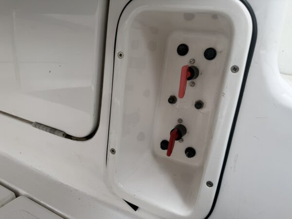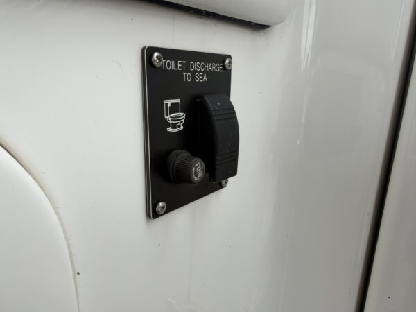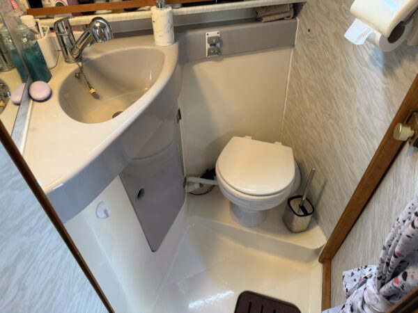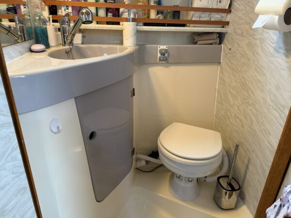 WC and shower compartment - on the starboard side with jack and jill doors into the living area and under-deck cabin, fully moulded with a fitted vanity unit incorporating the wash basin, mixer tap with shower attachment, shower tray and drain, manual sea toilet with diverter.