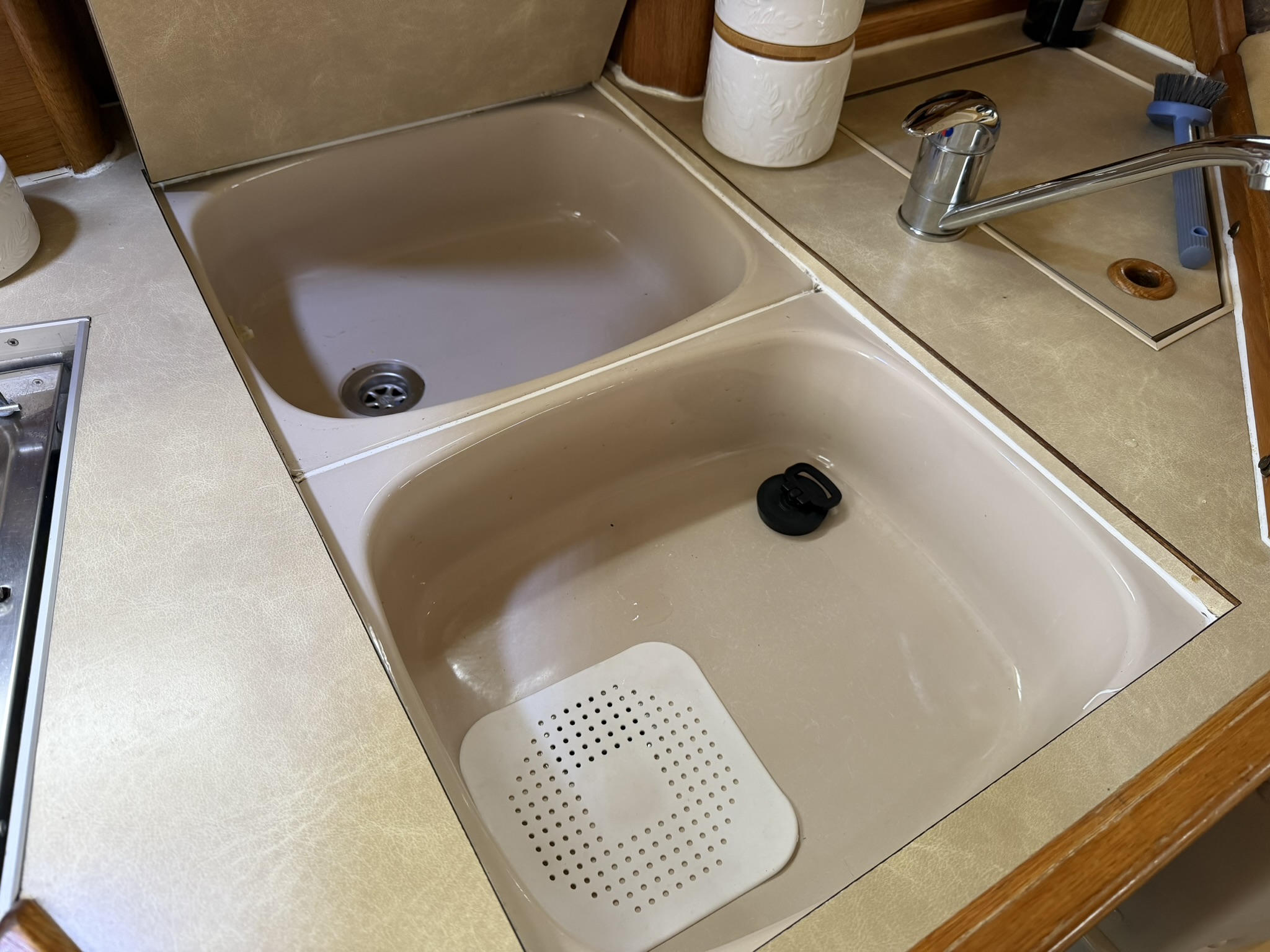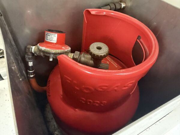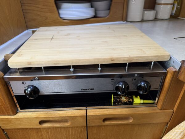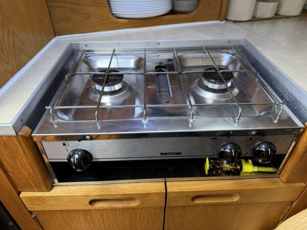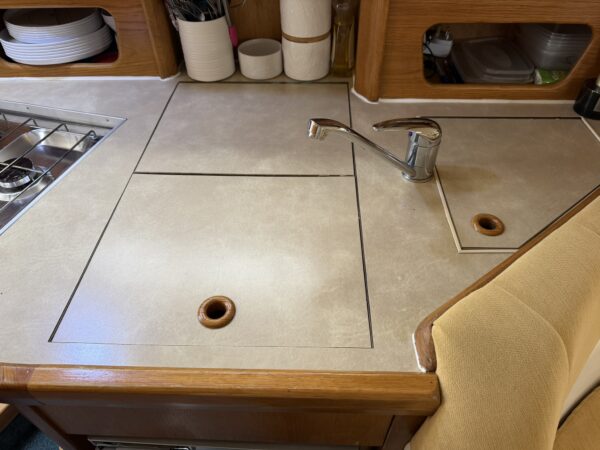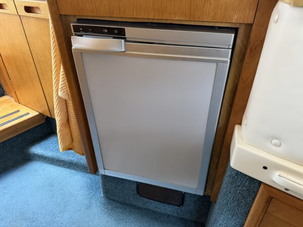 Galley – a compact yet comprehensive galley to port with storage cupboards and shelving, work surfaces, moulded double sink, hot and cold mixer tap, two ring hob and grill and two 12v fridges with freezer compartments.
