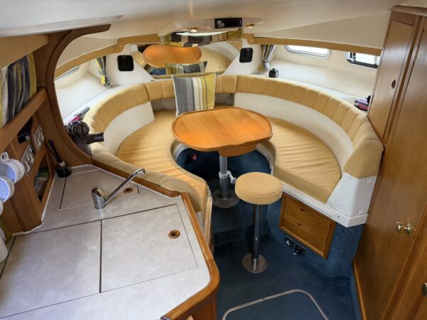 Forward seating - converts to a double berth with an infill, cabin table, storage lockers beneath the seating (currently containing the batteries), mirror, Houdini deck hatch and cabin windows.